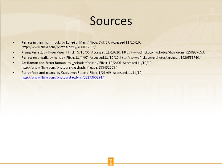 - Ferrets on a walk, by hans s / Flickr, 11/4/07. Accessed 11/10/10, http://www.flickr.com/photos/archeon/1929555740/