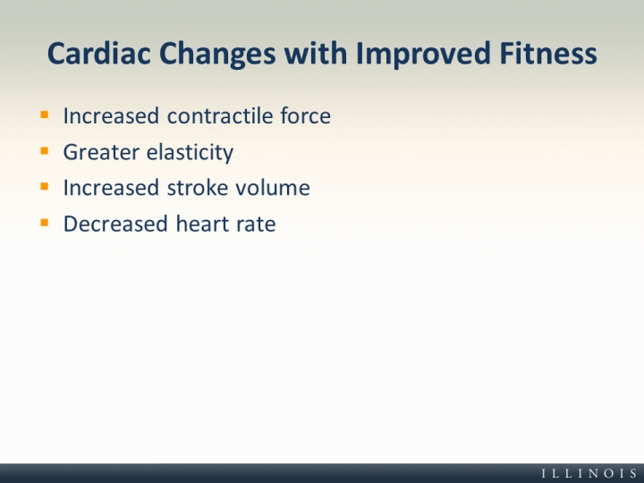 So when we have improved cardiorespiratory fitness, what happens to your heart? What are the changes in your heart that really drive that cardiorespiratory fitness improvement? The first is increased contractile force, so you're able to contract your heart with greater force, and again, that's not a voluntary contraction, but your heart is stronger, it's able to pump blood out with more force. Your heart is also better able to expand to let more blood in, which means—because more blood can flow in and you're able to contract with more force—you have an increased stroke volume. Additionally, a very fit person will have a lower heart rate than an unfit person when doing the same amount of work, and you could really think about this as your body becoming more efficient, your heart becoming more efficient in particular; more blood can be pumped out with fewer beats.