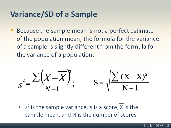 - s2 is the sample variance, X is a score, X is the sample mean, and N is the number of scores