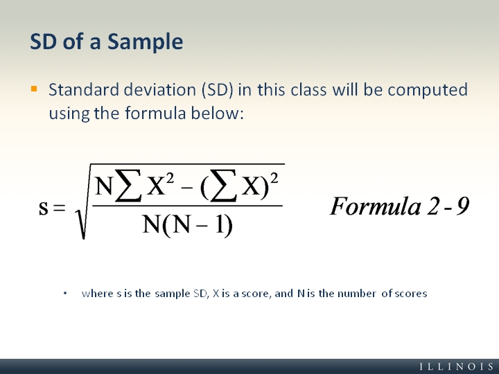 Standard deviation (SD) in this class will be computed using the formula below: